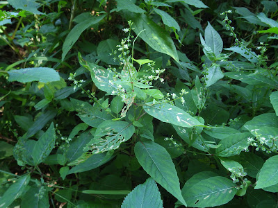 夏の自然観察会を有峰森林公園で行いました。スタッフを入れて9名が亀谷料金所に集まり、分乗して有峰湖に向かいました。猛暑の下界よりはマシな気温でしたが、陽が当たる場所ではジリジリと焼ける暑さでした。林内に入ってしまえば、過ごしやすかったです。花が少ない時期ですが、ミズナラ林、ブナ林、それと植栽されたカラマツ林を巡りそれぞれの林の違いを堪能しました。リョウブ、ノリウツギ、ヤマブキショウマ、サラシナショウマ、ヨツバヒヨドリが白い花を咲かせ、キツリフネソウ、ツリフネソウが風鈴のように涼しげに花を咲かせていました。特にツリフネソウはふつうは赤色ですが、白色からピンク色まで花色に変異があることにみな驚いていました。そのほか、ノギラン、ソバナ、タニタデ、ホツツジ、エゾシロネの花が見られました。ケナシヤブデマリやアカモノ、トチバニンジンは果実を付けていました。昼食後、ぼちぼち戻ろうかという時に雷が鳴り始め、一気に土砂降りになったので、ゲートが閉まらないうちに下山しました。